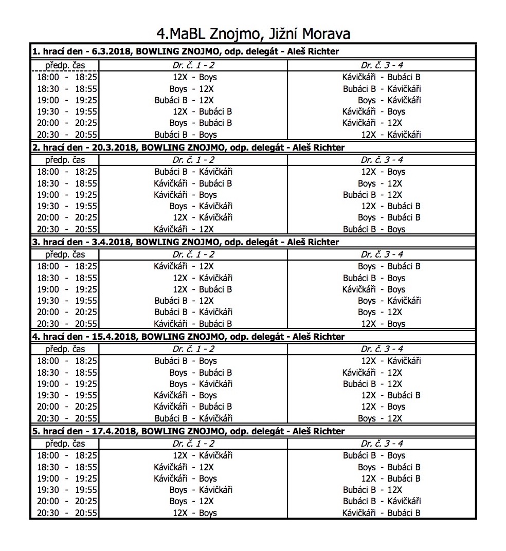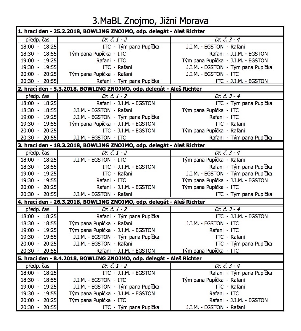 V neděli 25.3.2018 zahájíme jarní část Amatérské bowlingové ligy, ročník 2017/2018. Níže naleznete termíny jednotlivých ligových hracích dnů a rozlosování.