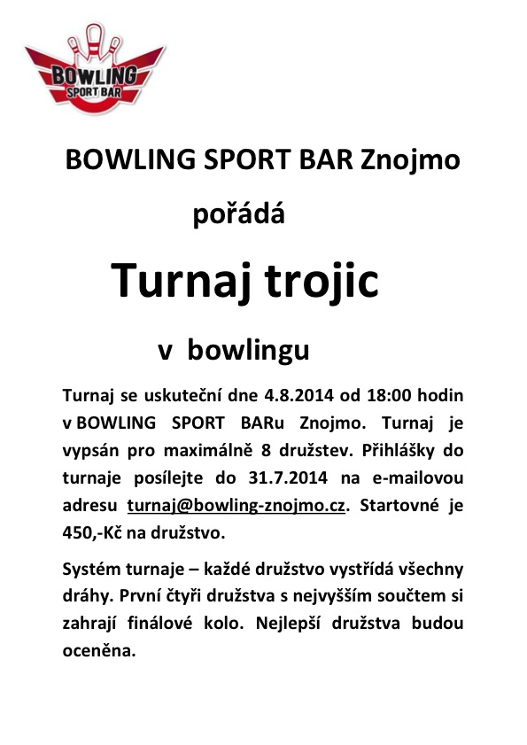 dne 4.8.2014 od 18:00 hodin se v BOWLING SPORT BARu Znojmo bude konat Turanj trojic. Turnaj je vypsán pro maximálně 8 družstev. Přihlášky do turnaje posílejte do 31.7.2014 na e-mailovou adresu turnaj@bowling-znojmo.cz.