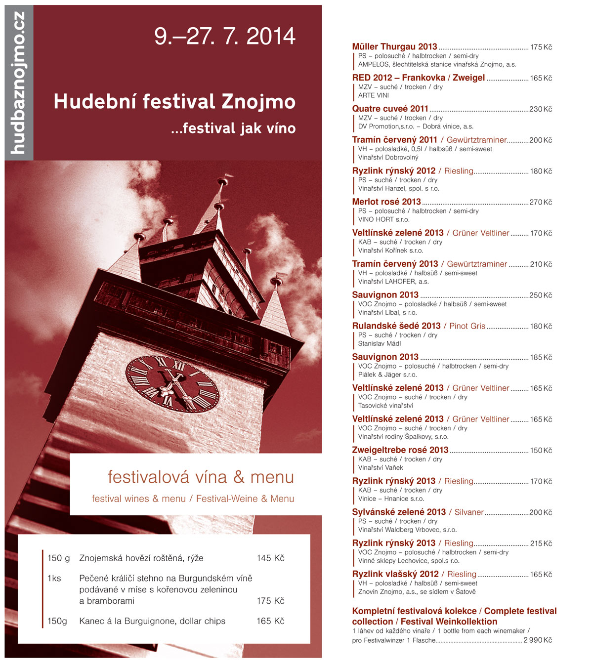 Jako již tradičně jsme součastí Hudebního festivalu Znojmo, který se koná od 9. do 27. července 2014. V rámci festivalu nabízíme speciální festivalové menu a vyborná festivalová vína.