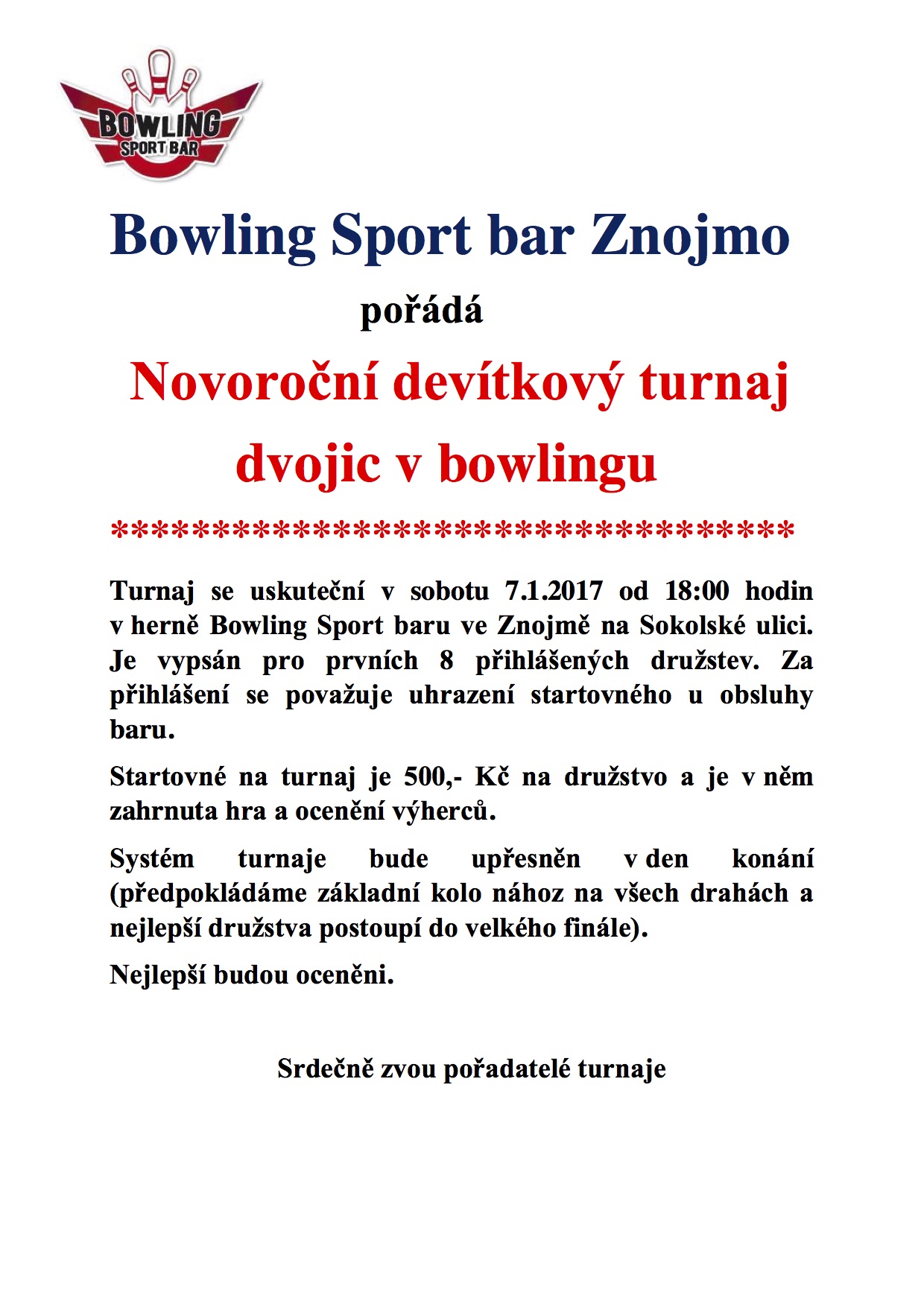 Rádi bychom Vás pozvali na "Novoroční devítkový turnaj dvojic", který proběhne 7.1.2017. Více informací naleznete v článku.