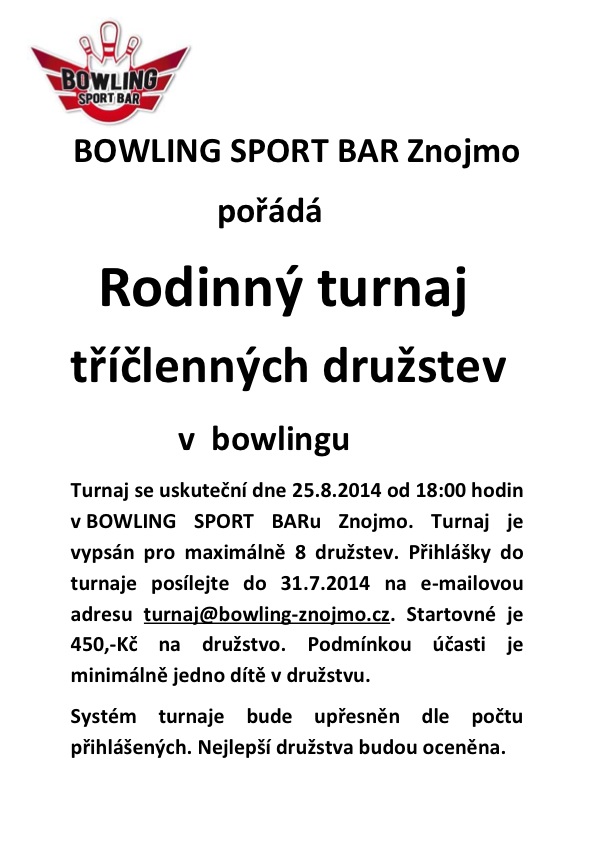 dne 25.8.2014 od 18:00 hodin se v BOWLING SPORT BARu Znojmo bude konat Rodinný turnaj tříčlenných dužstev. Turnaj je vypsán pro maximálně 8 družstev. Přihlášky do turnaje posílejte do 31.7.2014 na e-mailovou adresu turnaj@bowling-znojmo.cz.