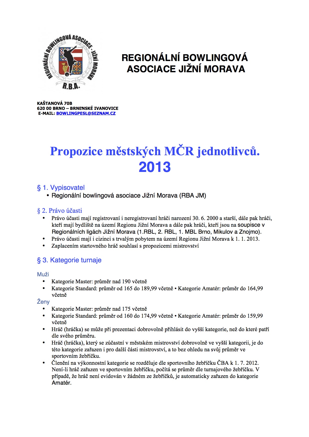 Mistrovstvím města Znojma je oficiální turnaj jednotlivců pořádaný Regionální bowlingovou asociací Jižní Moravy. Turnaj se hraje ve dvou hracích dnech. Vice informací v příložených propozicích nebo v naší herně.