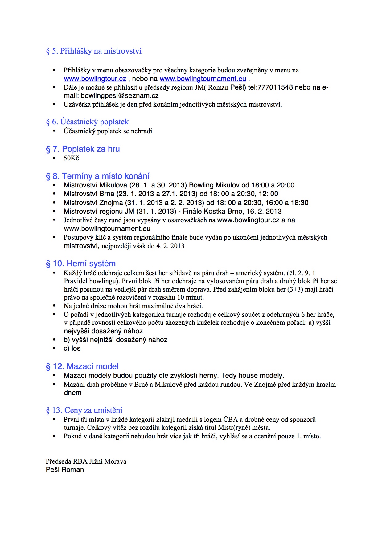 Naše bowlingová herna se stala součástí oficiálního turnaje Mistrovství měst Brno, Mikulov a nově i Znojmo. Jedná se o turnaj jednotlivců, jehož vyvrcholením je turnaj vítězů městskych mistrovství. Jedná se turnaj, ve kterém jsou hráčí rozděleni výkonostně, tudíž jsou podmínky výrazně rovnocenné. Soutěží zvlášť ženy a muži, navíc jsou obě skupiny rozděleny dle průměrných náhozů. Každý hráč odehraje šest her (10. framových kol), které se mu budoupočítat do výsledku. Startovné se nehradí, hradí se pouze poplatek 50,-/hru, celkem tedy 300,- Kč.