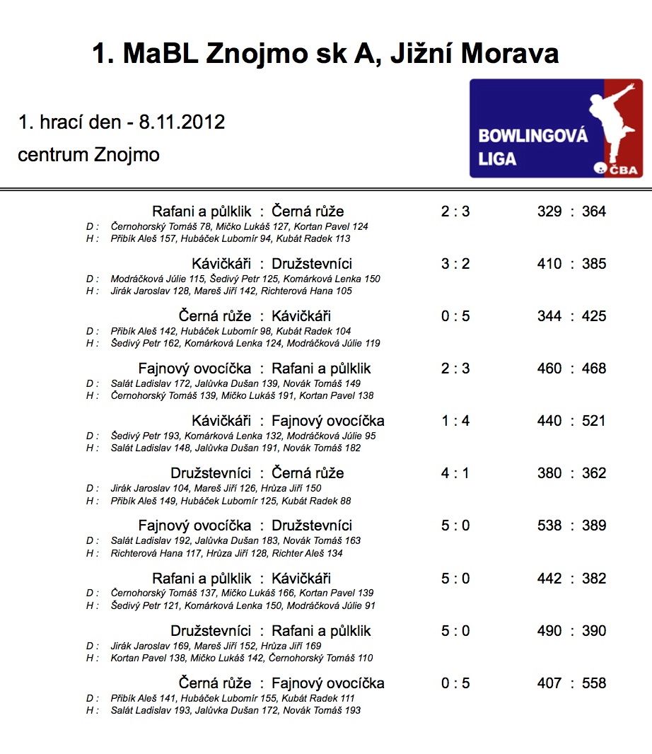 Přinášíme vám informace o 1. Městské amatérské bowlingové lize. Ve čtvrtek 8.11.2012 proběhlo 1. kolo skupiny A, jehož výsledky vám nyní prinášíme.