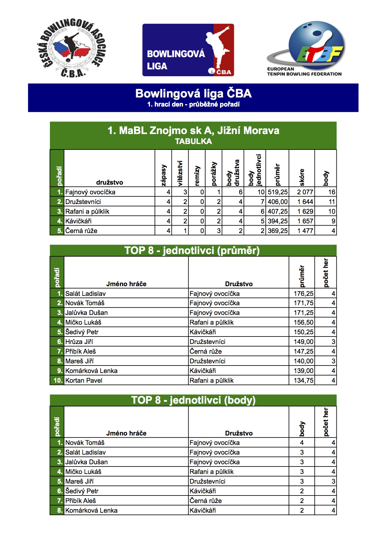 V rámci 1. kola se utkalo 5 týmů skupiny A. Hráči tak zahajili 1. amatérskou bowlingovou ligu ve Znojmě. Niže je aktuální postavení týmů po prvním hracím dni a výsledky jednotlivců.
