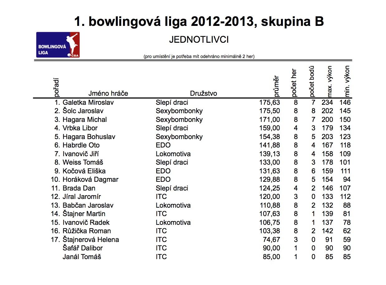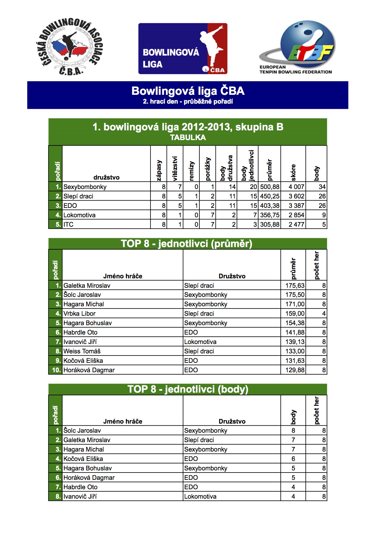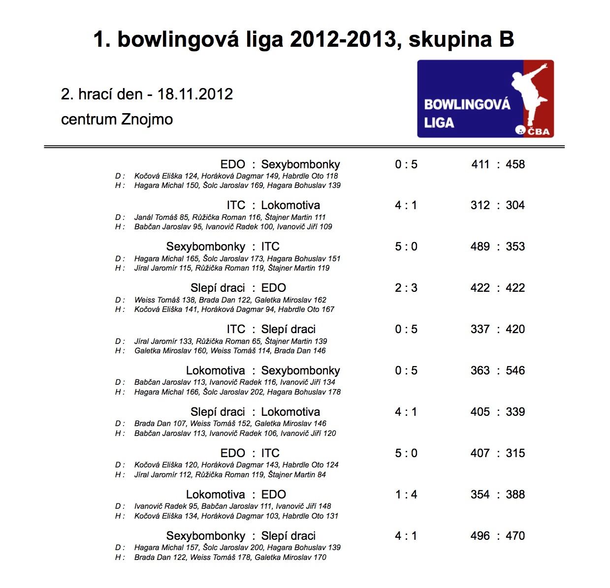 Přinášíme vám aktuální výsledky druhého kola skupiny "B" 1. Městské amatérské bowlingové ligy, které se konalo 18.11.2012.