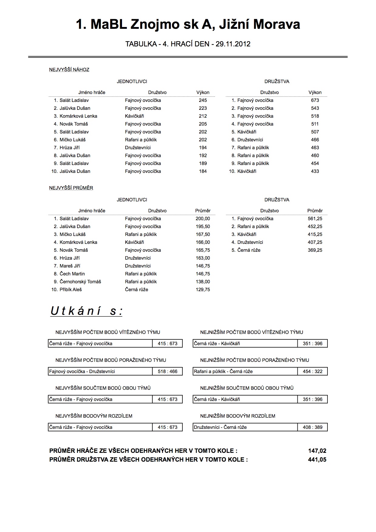 29.11.2012 proběhlo poslední, 4. kolo ligy, které určí pořadí do finálního "boje". Jako obvykle vám touto cestou zveřejnˇujeme aktuální výsledky, které budou i na nástěnce v herně. Rozpis finálního kola zveřejníme a zárovenˇ rozešleme el. poštou po odehrání 4. kola skupiny "B".